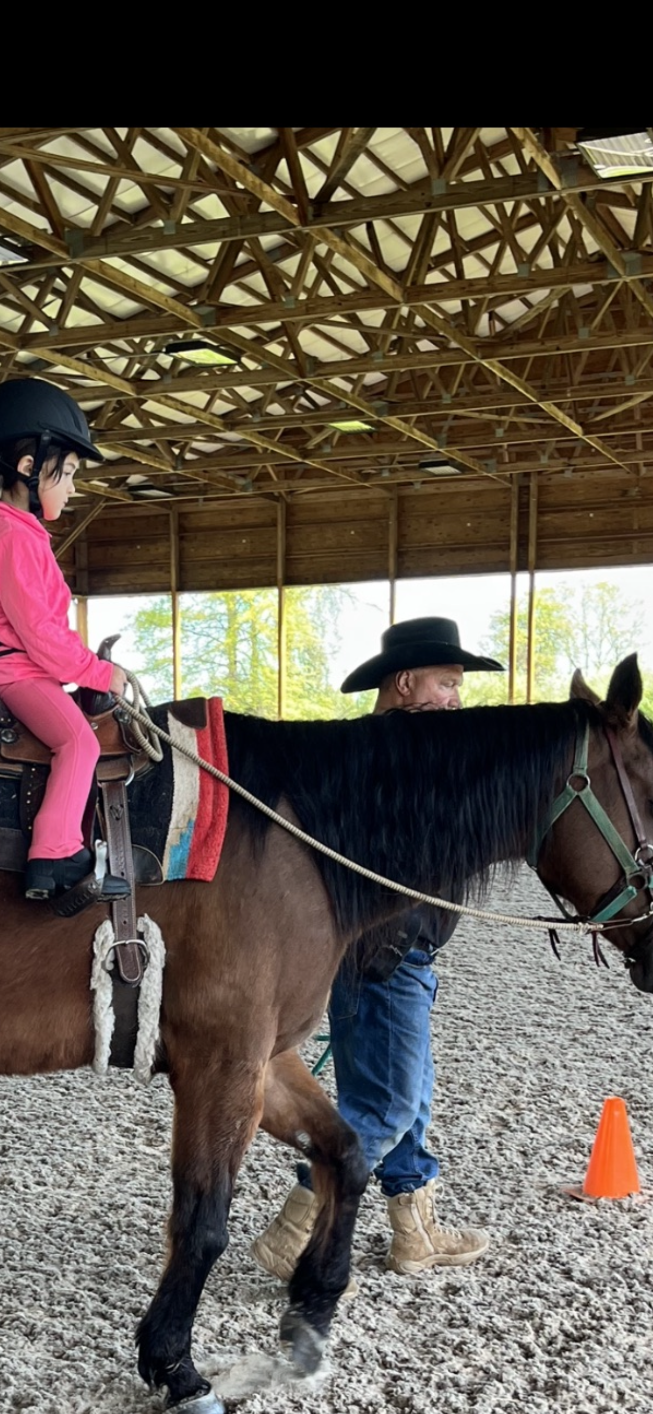 Tom Reno who has had many years of horsemanship experience living in Wyoming & Eastern Oregon for hunting and fishing expeditions. This is a 3-year-old first time on a horse after taking a lesson for Tom.